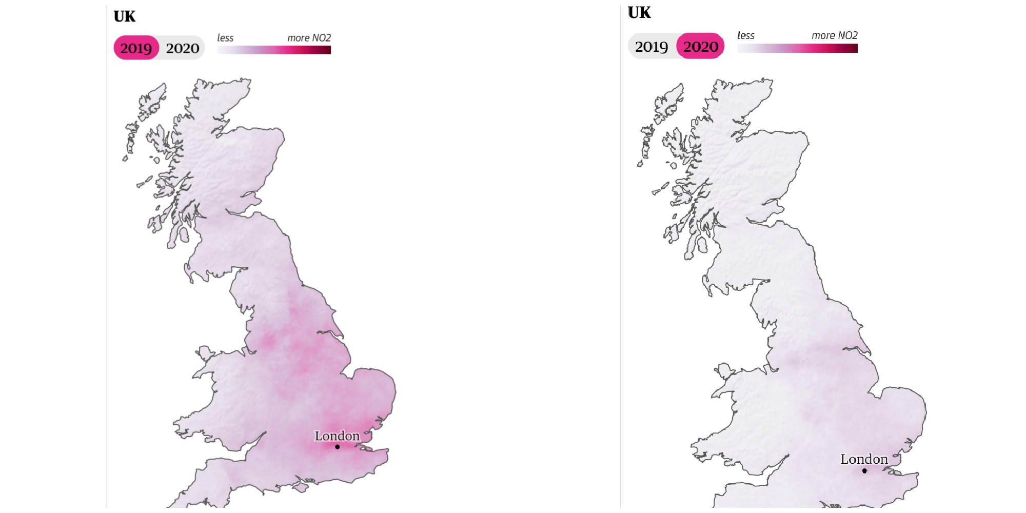 Mai jos puteți vedea cum a evoluat tendința de minimizare a poluării aerului deasupra unor țări care au respectat restricțiile anunțate din cauza coronavirusului.